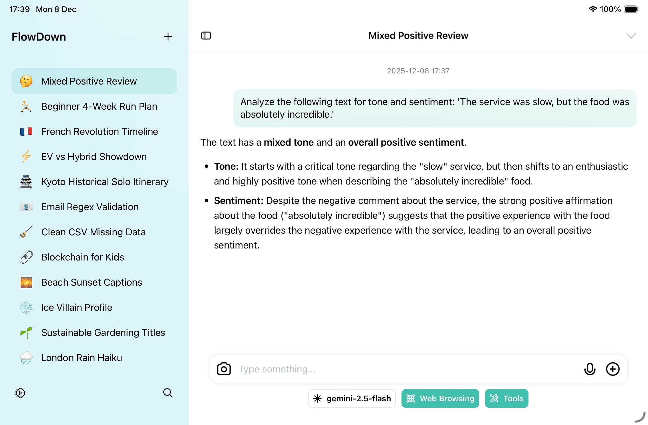 FlowDown provides an immersive chat interface, supports local models, and can sync data via iCloud. This guide combines the first-chat steps with everyday usage.